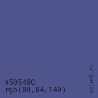 Цвет #50548C в цветовой модели RGB обозначается тремя октетами (80, 84, 140) в десятичном формате и #50548C в шестнадцатиричном (hex) формате, которые являются интенсивностью красного 80 (hex 50), интенсивность зелёного 84 (hex 54) и интенсивность синего 140 (hex 8C).