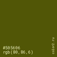 Цвет #505606 в цветовой модели RGB обозначается тремя октетами (80, 86, 6) в десятичном формате и #505606 в шестнадцатиричном (hex) формате, которые являются интенсивностью красного 80 (hex 50), интенсивность зелёного 86 (hex 56) и интенсивность синего 6 (hex 06).