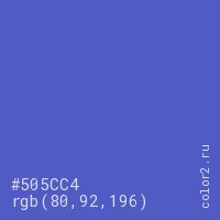 Цвет #505CC4 в цветовой модели RGB обозначается тремя октетами (80, 92, 196) в десятичном формате и #505CC4 в шестнадцатиричном (hex) формате, которые являются интенсивностью красного 80 (hex 50), интенсивность зелёного 92 (hex 5C) и интенсивность синего 196 (hex C4).