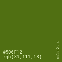 Цвет #506F12 в цветовой модели RGB обозначается тремя октетами (80, 111, 18) в десятичном формате и #506F12 в шестнадцатиричном (hex) формате, которые являются интенсивностью красного 80 (hex 50), интенсивность зелёного 111 (hex 6F) и интенсивность синего 18 (hex 12).