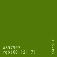 Цвет #507907 в цветовой модели RGB обозначается тремя октетами (80, 121, 7) в десятичном формате и #507907 в шестнадцатиричном (hex) формате, которые являются интенсивностью красного 80 (hex 50), интенсивность зелёного 121 (hex 79) и интенсивность синего 7 (hex 07).