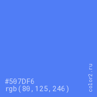 Цвет #507DF6 в цветовой модели RGB обозначается тремя октетами (80, 125, 246) в десятичном формате и #507DF6 в шестнадцатиричном (hex) формате, которые являются интенсивностью красного 80 (hex 50), интенсивность зелёного 125 (hex 7D) и интенсивность синего 246 (hex F6).