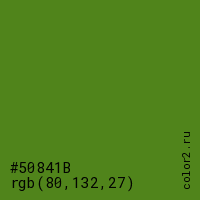 Цвет #50841B в цветовой модели RGB обозначается тремя октетами (80, 132, 27) в десятичном формате и #50841B в шестнадцатиричном (hex) формате, которые являются интенсивностью красного 80 (hex 50), интенсивность зелёного 132 (hex 84) и интенсивность синего 27 (hex 1B).