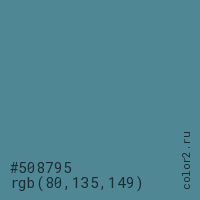 Цвет #508795 в цветовой модели RGB обозначается тремя октетами (80, 135, 149) в десятичном формате и #508795 в шестнадцатиричном (hex) формате, которые являются интенсивностью красного 80 (hex 50), интенсивность зелёного 135 (hex 87) и интенсивность синего 149 (hex 95).
