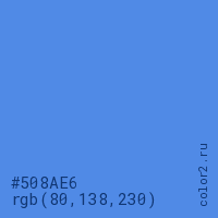 Цвет #508AE6 в цветовой модели RGB обозначается тремя октетами (80, 138, 230) в десятичном формате и #508AE6 в шестнадцатиричном (hex) формате, которые являются интенсивностью красного 80 (hex 50), интенсивность зелёного 138 (hex 8A) и интенсивность синего 230 (hex E6).