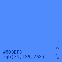 Цвет #508BFD в цветовой модели RGB обозначается тремя октетами (80, 139, 253) в десятичном формате и #508BFD в шестнадцатиричном (hex) формате, которые являются интенсивностью красного 80 (hex 50), интенсивность зелёного 139 (hex 8B) и интенсивность синего 253 (hex FD).