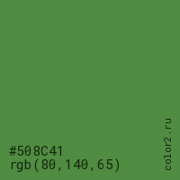 Цвет #508C41 в цветовой модели RGB обозначается тремя октетами (80, 140, 65) в десятичном формате и #508C41 в шестнадцатиричном (hex) формате, которые являются интенсивностью красного 80 (hex 50), интенсивность зелёного 140 (hex 8C) и интенсивность синего 65 (hex 41).