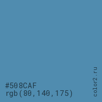 Цвет #508CAF в цветовой модели RGB обозначается тремя октетами (80, 140, 175) в десятичном формате и #508CAF в шестнадцатиричном (hex) формате, которые являются интенсивностью красного 80 (hex 50), интенсивность зелёного 140 (hex 8C) и интенсивность синего 175 (hex AF).