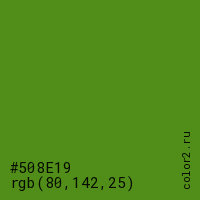 Цвет #508E19 в цветовой модели RGB обозначается тремя октетами (80, 142, 25) в десятичном формате и #508E19 в шестнадцатиричном (hex) формате, которые являются интенсивностью красного 80 (hex 50), интенсивность зелёного 142 (hex 8E) и интенсивность синего 25 (hex 19).