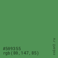 Цвет #509355 в цветовой модели RGB обозначается тремя октетами (80, 147, 85) в десятичном формате и #509355 в шестнадцатиричном (hex) формате, которые являются интенсивностью красного 80 (hex 50), интенсивность зелёного 147 (hex 93) и интенсивность синего 85 (hex 55).