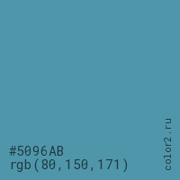 Цвет #5096AB в цветовой модели RGB обозначается тремя октетами (80, 150, 171) в десятичном формате и #5096AB в шестнадцатиричном (hex) формате, которые являются интенсивностью красного 80 (hex 50), интенсивность зелёного 150 (hex 96) и интенсивность синего 171 (hex AB).