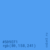 Цвет #509EF1 в цветовой модели RGB обозначается тремя октетами (80, 158, 241) в десятичном формате и #509EF1 в шестнадцатиричном (hex) формате, которые являются интенсивностью красного 80 (hex 50), интенсивность зелёного 158 (hex 9E) и интенсивность синего 241 (hex F1).