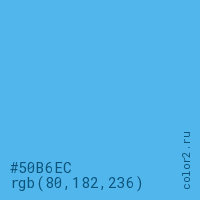 Цвет #50B6EC в цветовой модели RGB обозначается тремя октетами (80, 182, 236) в десятичном формате и #50B6EC в шестнадцатиричном (hex) формате, которые являются интенсивностью красного 80 (hex 50), интенсивность зелёного 182 (hex B6) и интенсивность синего 236 (hex EC).