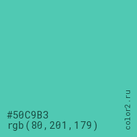 Цвет #50C9B3 в цветовой модели RGB обозначается тремя октетами (80, 201, 179) в десятичном формате и #50C9B3 в шестнадцатиричном (hex) формате, которые являются интенсивностью красного 80 (hex 50), интенсивность зелёного 201 (hex C9) и интенсивность синего 179 (hex B3).