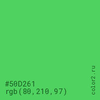 Цвет #50D261 в цветовой модели RGB обозначается тремя октетами (80, 210, 97) в десятичном формате и #50D261 в шестнадцатиричном (hex) формате, которые являются интенсивностью красного 80 (hex 50), интенсивность зелёного 210 (hex D2) и интенсивность синего 97 (hex 61).