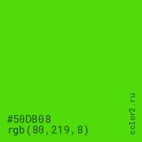 Цвет #50DB08 в цветовой модели RGB обозначается тремя октетами (80, 219, 8) в десятичном формате и #50DB08 в шестнадцатиричном (hex) формате, которые являются интенсивностью красного 80 (hex 50), интенсивность зелёного 219 (hex DB) и интенсивность синего 8 (hex 08).