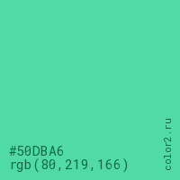 Цвет #50DBA6 в цветовой модели RGB обозначается тремя октетами (80, 219, 166) в десятичном формате и #50DBA6 в шестнадцатиричном (hex) формате, которые являются интенсивностью красного 80 (hex 50), интенсивность зелёного 219 (hex DB) и интенсивность синего 166 (hex A6).