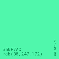 Цвет #50F7AC в цветовой модели RGB обозначается тремя октетами (80, 247, 172) в десятичном формате и #50F7AC в шестнадцатиричном (hex) формате, которые являются интенсивностью красного 80 (hex 50), интенсивность зелёного 247 (hex F7) и интенсивность синего 172 (hex AC).