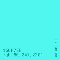 Цвет #50F7EE в цветовой модели RGB обозначается тремя октетами (80, 247, 238) в десятичном формате и #50F7EE в шестнадцатиричном (hex) формате, которые являются интенсивностью красного 80 (hex 50), интенсивность зелёного 247 (hex F7) и интенсивность синего 238 (hex EE).