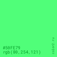 Цвет #50FE79 в цветовой модели RGB обозначается тремя октетами (80, 254, 121) в десятичном формате и #50FE79 в шестнадцатиричном (hex) формате, которые являются интенсивностью красного 80 (hex 50), интенсивность зелёного 254 (hex FE) и интенсивность синего 121 (hex 79).