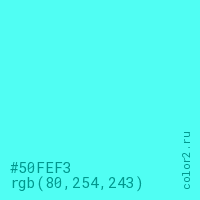 Цвет #50FEF3 в цветовой модели RGB обозначается тремя октетами (80, 254, 243) в десятичном формате и #50FEF3 в шестнадцатиричном (hex) формате, которые являются интенсивностью красного 80 (hex 50), интенсивность зелёного 254 (hex FE) и интенсивность синего 243 (hex F3).