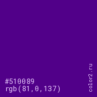 Цвет #510089 в цветовой модели RGB обозначается тремя октетами (81, 0, 137) в десятичном формате и #510089 в шестнадцатиричном (hex) формате, которые являются интенсивностью красного 81 (hex 51), интенсивность зелёного 0 (hex 00) и интенсивность синего 137 (hex 89).