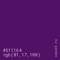 Цвет #511164 в цветовой модели RGB обозначается тремя октетами (81, 17, 100) в десятичном формате и #511164 в шестнадцатиричном (hex) формате, которые являются интенсивностью красного 81 (hex 51), интенсивность зелёного 17 (hex 11) и интенсивность синего 100 (hex 64).