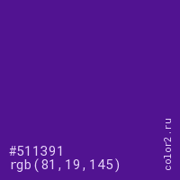 Цвет #511391 в цветовой модели RGB обозначается тремя октетами (81, 19, 145) в десятичном формате и #511391 в шестнадцатиричном (hex) формате, которые являются интенсивностью красного 81 (hex 51), интенсивность зелёного 19 (hex 13) и интенсивность синего 145 (hex 91).