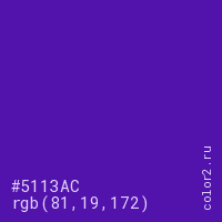 Цвет #5113AC в цветовой модели RGB обозначается тремя октетами (81, 19, 172) в десятичном формате и #5113AC в шестнадцатиричном (hex) формате, которые являются интенсивностью красного 81 (hex 51), интенсивность зелёного 19 (hex 13) и интенсивность синего 172 (hex AC).