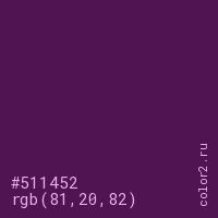 Цвет #511452 в цветовой модели RGB обозначается тремя октетами (81, 20, 82) в десятичном формате и #511452 в шестнадцатиричном (hex) формате, которые являются интенсивностью красного 81 (hex 51), интенсивность зелёного 20 (hex 14) и интенсивность синего 82 (hex 52).