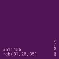 Цвет #511455 в цветовой модели RGB обозначается тремя октетами (81, 20, 85) в десятичном формате и #511455 в шестнадцатиричном (hex) формате, которые являются интенсивностью красного 81 (hex 51), интенсивность зелёного 20 (hex 14) и интенсивность синего 85 (hex 55).