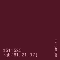 Цвет #511525 в цветовой модели RGB обозначается тремя октетами (81, 21, 37) в десятичном формате и #511525 в шестнадцатиричном (hex) формате, которые являются интенсивностью красного 81 (hex 51), интенсивность зелёного 21 (hex 15) и интенсивность синего 37 (hex 25).