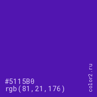 Цвет #5115B0 в цветовой модели RGB обозначается тремя октетами (81, 21, 176) в десятичном формате и #5115B0 в шестнадцатиричном (hex) формате, которые являются интенсивностью красного 81 (hex 51), интенсивность зелёного 21 (hex 15) и интенсивность синего 176 (hex B0).