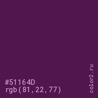 Цвет #51164D в цветовой модели RGB обозначается тремя октетами (81, 22, 77) в десятичном формате и #51164D в шестнадцатиричном (hex) формате, которые являются интенсивностью красного 81 (hex 51), интенсивность зелёного 22 (hex 16) и интенсивность синего 77 (hex 4D).