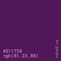 Цвет #511758 в цветовой модели RGB обозначается тремя октетами (81, 23, 88) в десятичном формате и #511758 в шестнадцатиричном (hex) формате, которые являются интенсивностью красного 81 (hex 51), интенсивность зелёного 23 (hex 17) и интенсивность синего 88 (hex 58).