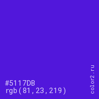 Цвет #5117DB в цветовой модели RGB обозначается тремя октетами (81, 23, 219) в десятичном формате и #5117DB в шестнадцатиричном (hex) формате, которые являются интенсивностью красного 81 (hex 51), интенсивность зелёного 23 (hex 17) и интенсивность синего 219 (hex DB).