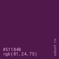 Цвет #51184B в цветовой модели RGB обозначается тремя октетами (81, 24, 75) в десятичном формате и #51184B в шестнадцатиричном (hex) формате, которые являются интенсивностью красного 81 (hex 51), интенсивность зелёного 24 (hex 18) и интенсивность синего 75 (hex 4B).