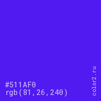 Цвет #511AF0 в цветовой модели RGB обозначается тремя октетами (81, 26, 240) в десятичном формате и #511AF0 в шестнадцатиричном (hex) формате, которые являются интенсивностью красного 81 (hex 51), интенсивность зелёного 26 (hex 1A) и интенсивность синего 240 (hex F0).