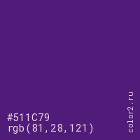 Цвет #511C79 в цветовой модели RGB обозначается тремя октетами (81, 28, 121) в десятичном формате и #511C79 в шестнадцатиричном (hex) формате, которые являются интенсивностью красного 81 (hex 51), интенсивность зелёного 28 (hex 1C) и интенсивность синего 121 (hex 79).