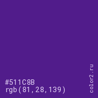 Цвет #511C8B в цветовой модели RGB обозначается тремя октетами (81, 28, 139) в десятичном формате и #511C8B в шестнадцатиричном (hex) формате, которые являются интенсивностью красного 81 (hex 51), интенсивность зелёного 28 (hex 1C) и интенсивность синего 139 (hex 8B).