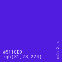 Цвет #511CE0 в цветовой модели RGB обозначается тремя октетами (81, 28, 224) в десятичном формате и #511CE0 в шестнадцатиричном (hex) формате, которые являются интенсивностью красного 81 (hex 51), интенсивность зелёного 28 (hex 1C) и интенсивность синего 224 (hex E0).