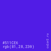 Цвет #511CE6 в цветовой модели RGB обозначается тремя октетами (81, 28, 230) в десятичном формате и #511CE6 в шестнадцатиричном (hex) формате, которые являются интенсивностью красного 81 (hex 51), интенсивность зелёного 28 (hex 1C) и интенсивность синего 230 (hex E6).