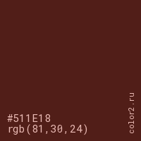 Цвет #511E18 в цветовой модели RGB обозначается тремя октетами (81, 30, 24) в десятичном формате и #511E18 в шестнадцатиричном (hex) формате, которые являются интенсивностью красного 81 (hex 51), интенсивность зелёного 30 (hex 1E) и интенсивность синего 24 (hex 18).