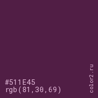 Цвет #511E45 в цветовой модели RGB обозначается тремя октетами (81, 30, 69) в десятичном формате и #511E45 в шестнадцатиричном (hex) формате, которые являются интенсивностью красного 81 (hex 51), интенсивность зелёного 30 (hex 1E) и интенсивность синего 69 (hex 45).