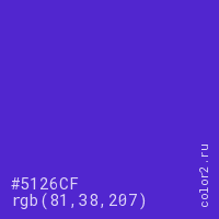 Цвет #5126CF в цветовой модели RGB обозначается тремя октетами (81, 38, 207) в десятичном формате и #5126CF в шестнадцатиричном (hex) формате, которые являются интенсивностью красного 81 (hex 51), интенсивность зелёного 38 (hex 26) и интенсивность синего 207 (hex CF).