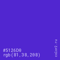 Цвет #5126D0 в цветовой модели RGB обозначается тремя октетами (81, 38, 208) в десятичном формате и #5126D0 в шестнадцатиричном (hex) формате, которые являются интенсивностью красного 81 (hex 51), интенсивность зелёного 38 (hex 26) и интенсивность синего 208 (hex D0).