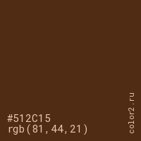 Цвет #512C15 в цветовой модели RGB обозначается тремя октетами (81, 44, 21) в десятичном формате и #512C15 в шестнадцатиричном (hex) формате, которые являются интенсивностью красного 81 (hex 51), интенсивность зелёного 44 (hex 2C) и интенсивность синего 21 (hex 15).
