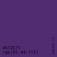 Цвет #512C71 в цветовой модели RGB обозначается тремя октетами (81, 44, 113) в десятичном формате и #512C71 в шестнадцатиричном (hex) формате, которые являются интенсивностью красного 81 (hex 51), интенсивность зелёного 44 (hex 2C) и интенсивность синего 113 (hex 71).