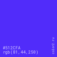 Цвет #512CFA в цветовой модели RGB обозначается тремя октетами (81, 44, 250) в десятичном формате и #512CFA в шестнадцатиричном (hex) формате, которые являются интенсивностью красного 81 (hex 51), интенсивность зелёного 44 (hex 2C) и интенсивность синего 250 (hex FA).