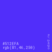 Цвет #512EFA в цветовой модели RGB обозначается тремя октетами (81, 46, 250) в десятичном формате и #512EFA в шестнадцатиричном (hex) формате, которые являются интенсивностью красного 81 (hex 51), интенсивность зелёного 46 (hex 2E) и интенсивность синего 250 (hex FA).
